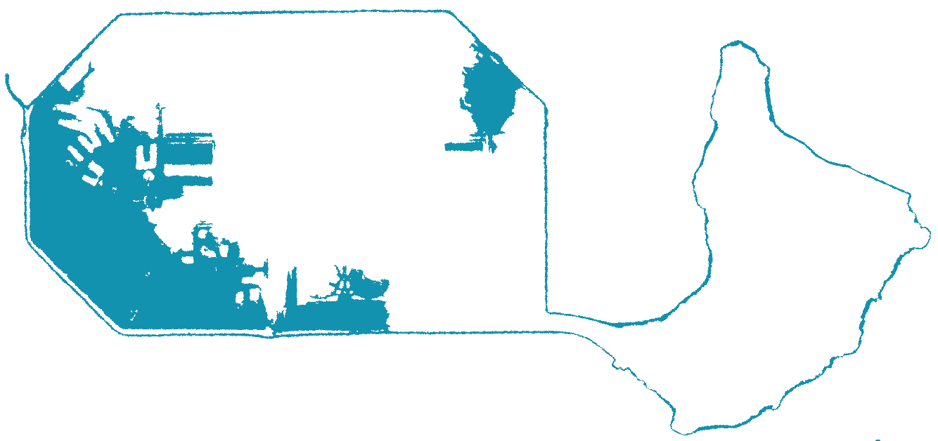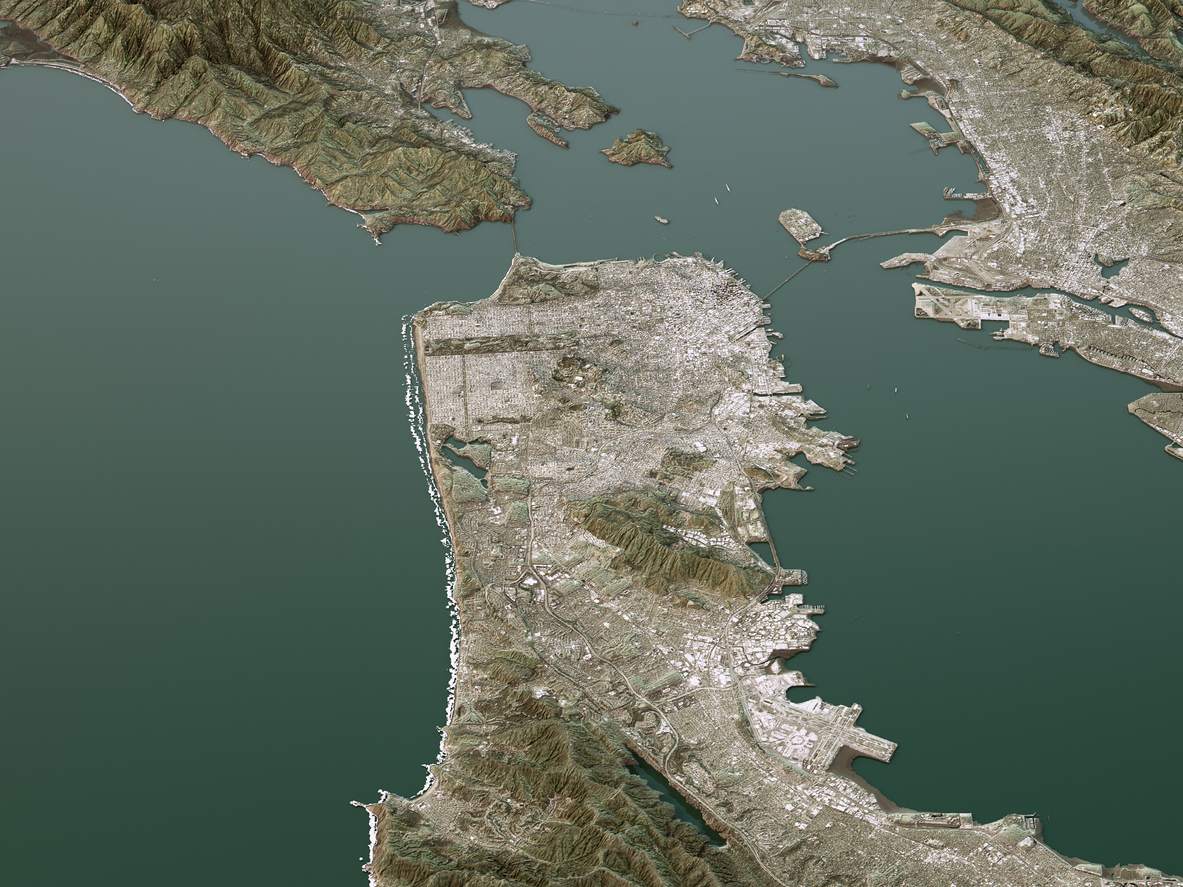 This is a rendering of the year 2100, projecting which parts of the Bay Area are most threatened by future SLR, combined with current rates of subsidence. Subsidence rates indicate how fast a particular piece of land is sinking. Without the reimagining of the island and its landscape, the northwest corner of Treasure Island would continue to sink at a fast rate. It has declined, however, and since 2004 the subsidence rate has deaccelerated by 40 per cent.
