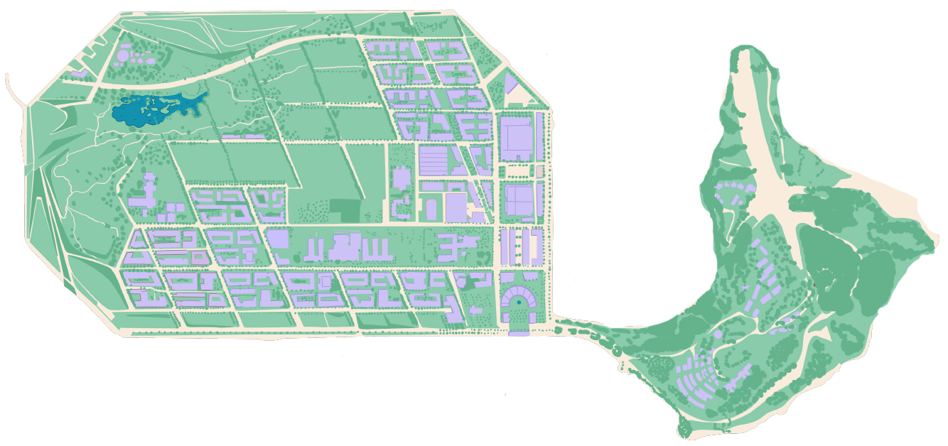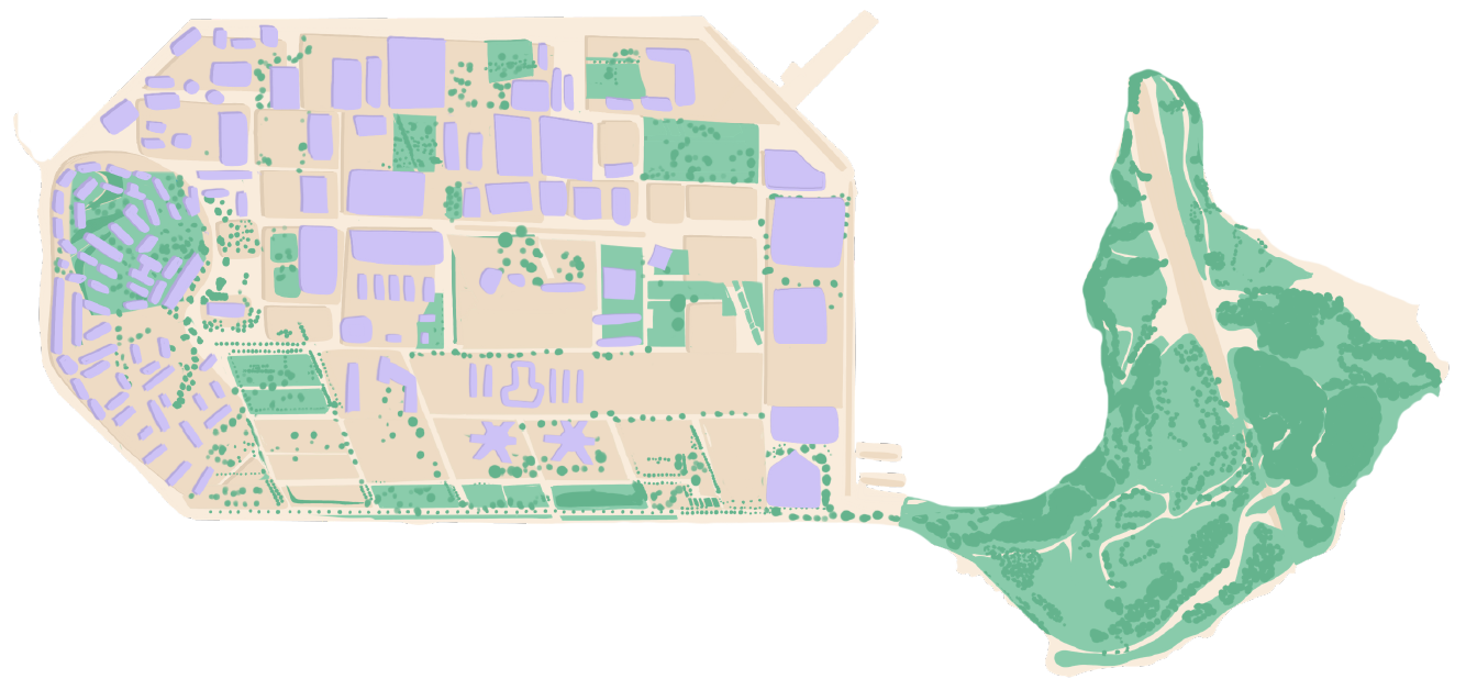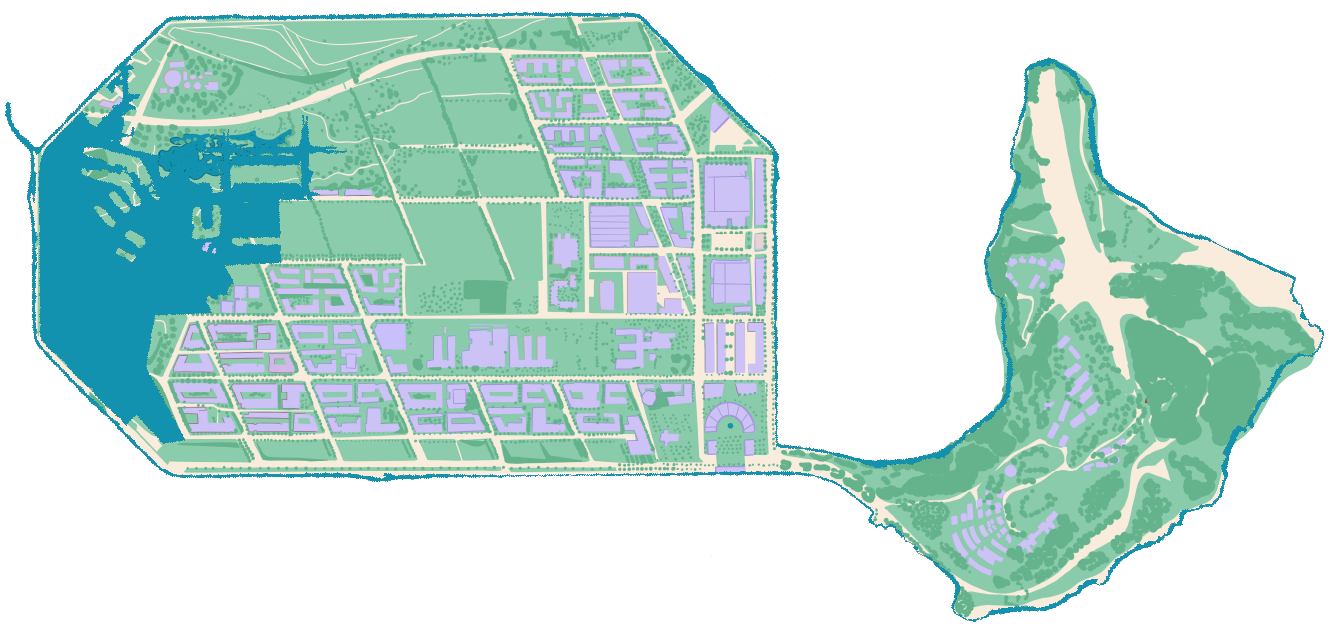 Toggle the buttons in the dynamic flood maps below to show probable flooding on Treasure Island if powerful storms were to occur in 2022, 2035, and/or 2050. The map on the left shows sea water inundation if the proposed adaptation measures are completed, while the map on the right shows what flooding would look like if the redevelopment were not to happen. The landscape at the north and northeast of the island will become open space and wetlands, an essential part of SLR mitigation as it can absorb flooding that in turn will nourish the island’s ecosystem.