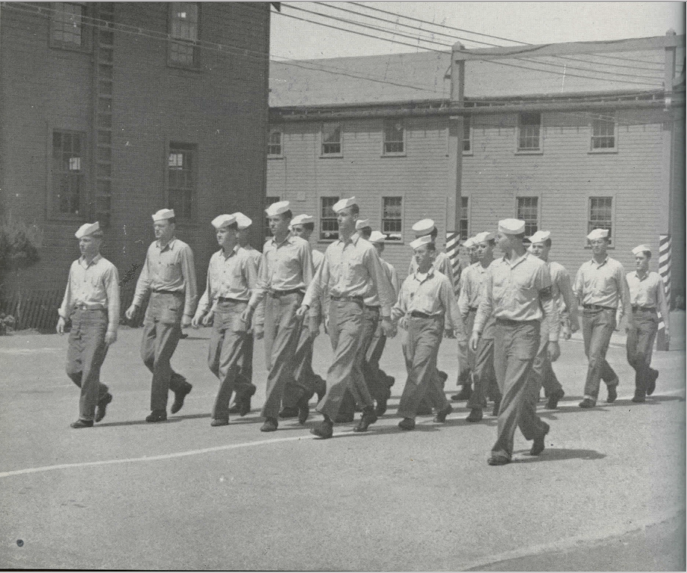 Here sailors march in their dungaree uniforms and dixie cup hats after World War II had begun. (The U.S. Navy, 1946)
