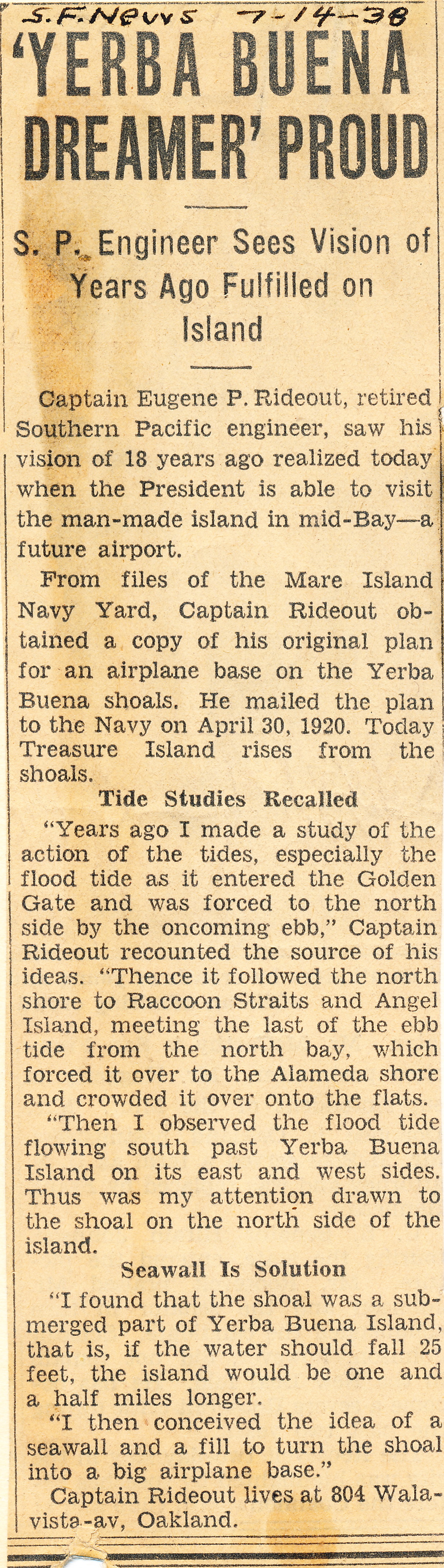 Captain Eugene Rideout of the Southern Pacific Railroad is often credited as the first, in 1920, with the idea to build an island atop Yerba Buena Shoals.