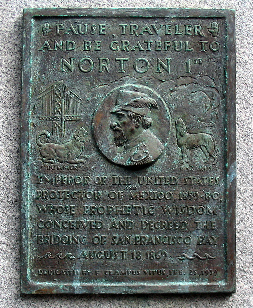 This plaque on the old Bay Bridge recognized Norton's decree. It now decorates the overlook for the new Bay Bridge. (Wikimedia Commons, 1959)