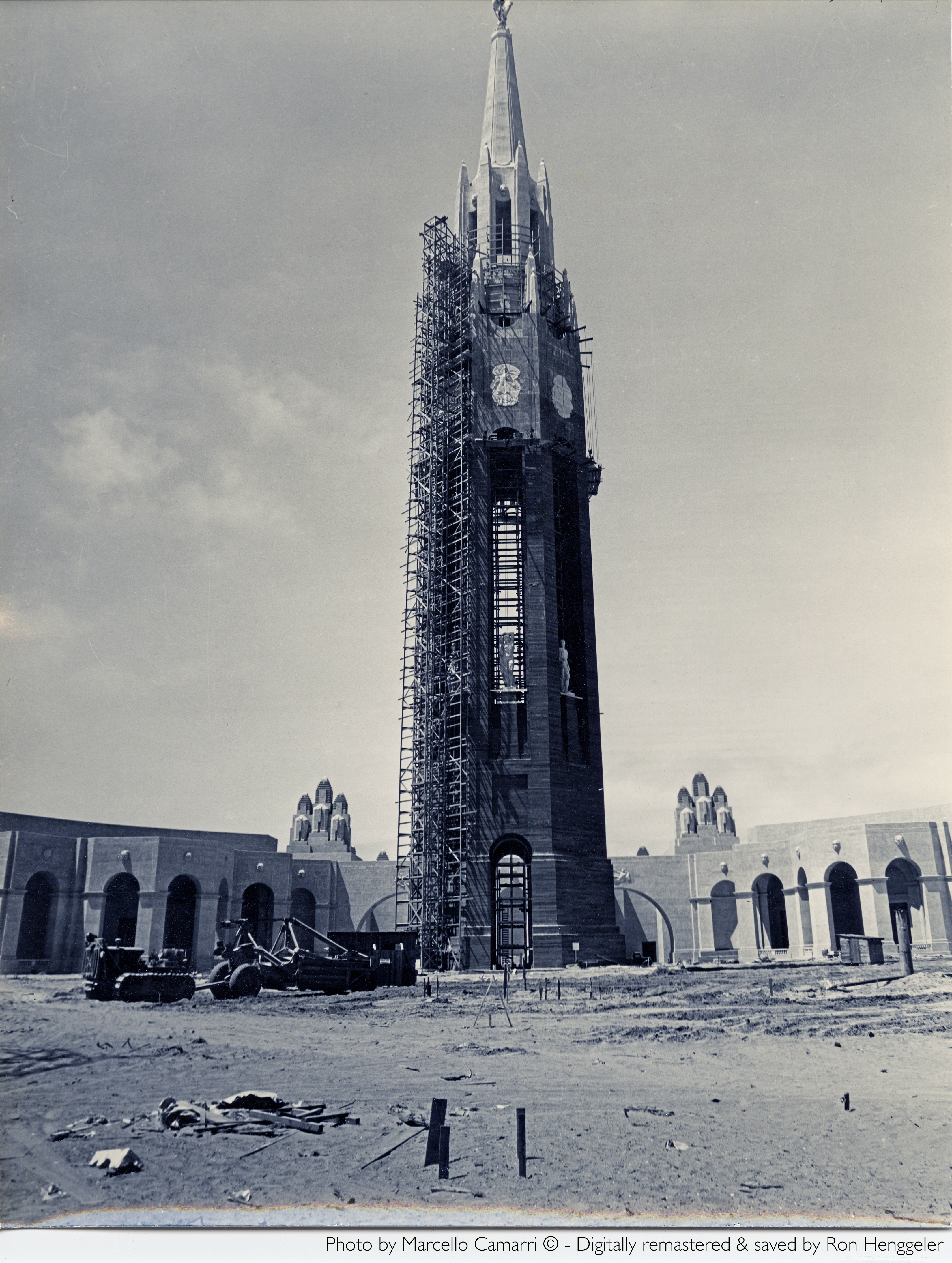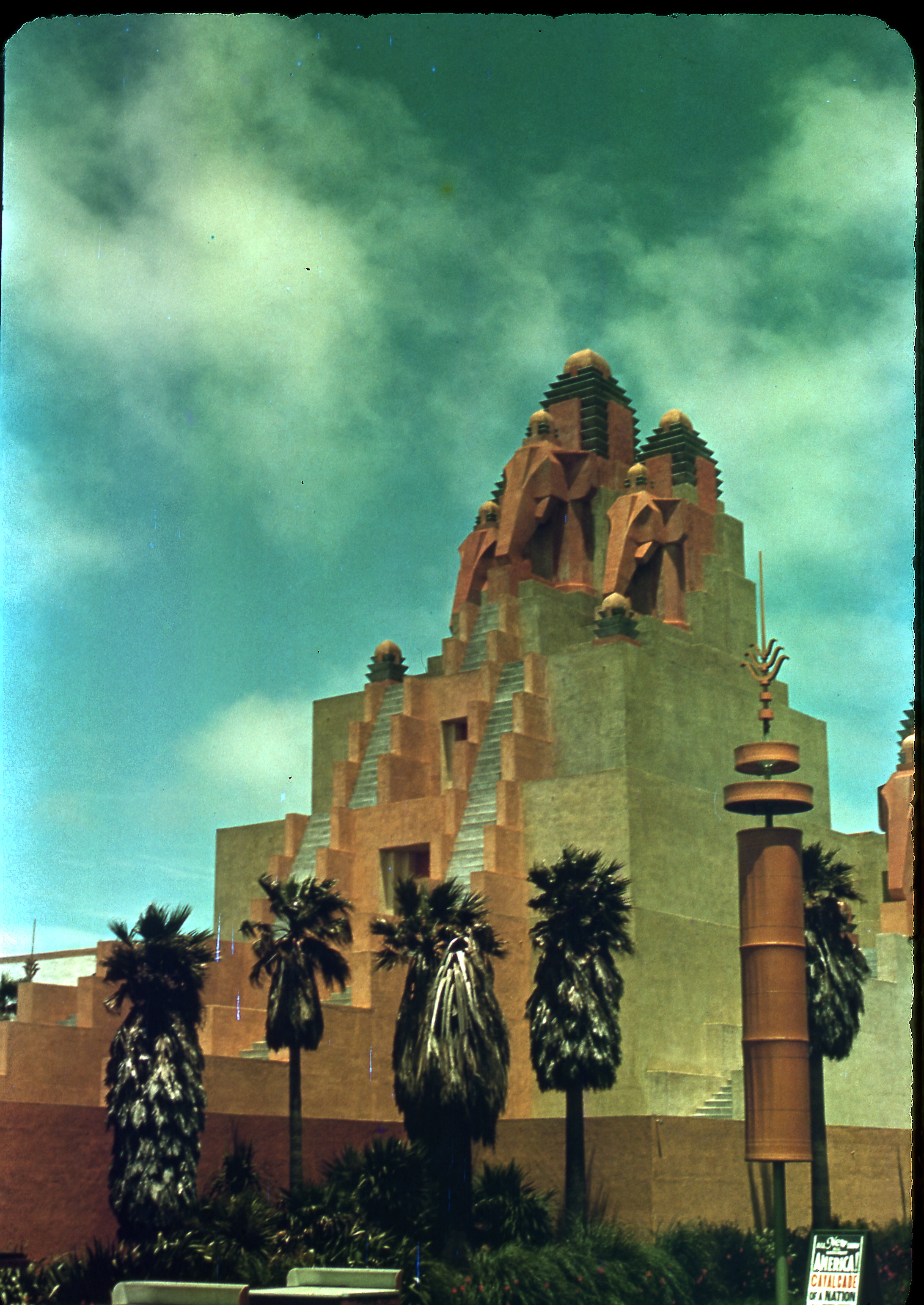 The elephant details were inspired by the Terrace of the Elephants at Angkor Wat, a large city of ancient temples in Cambodia. The structure also paid homage to Aztec and Mayan architecture of Mexico and the Northern Triangle. (Treasure Island Museum/ Paul Totah, 1939)