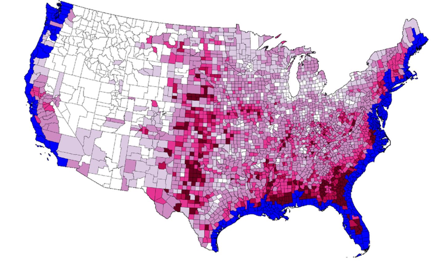 This map illustrates the probability that by 2100 as many as 13 million people in U.S. coastal communities will be forced out of their homes and businesses due to sea level rise. The red and light purple counties show where they are most Iikely to settle once displaced. (Bloomberg/plos.org © 2020 Robinson et al, Creative Commons Attribution License)