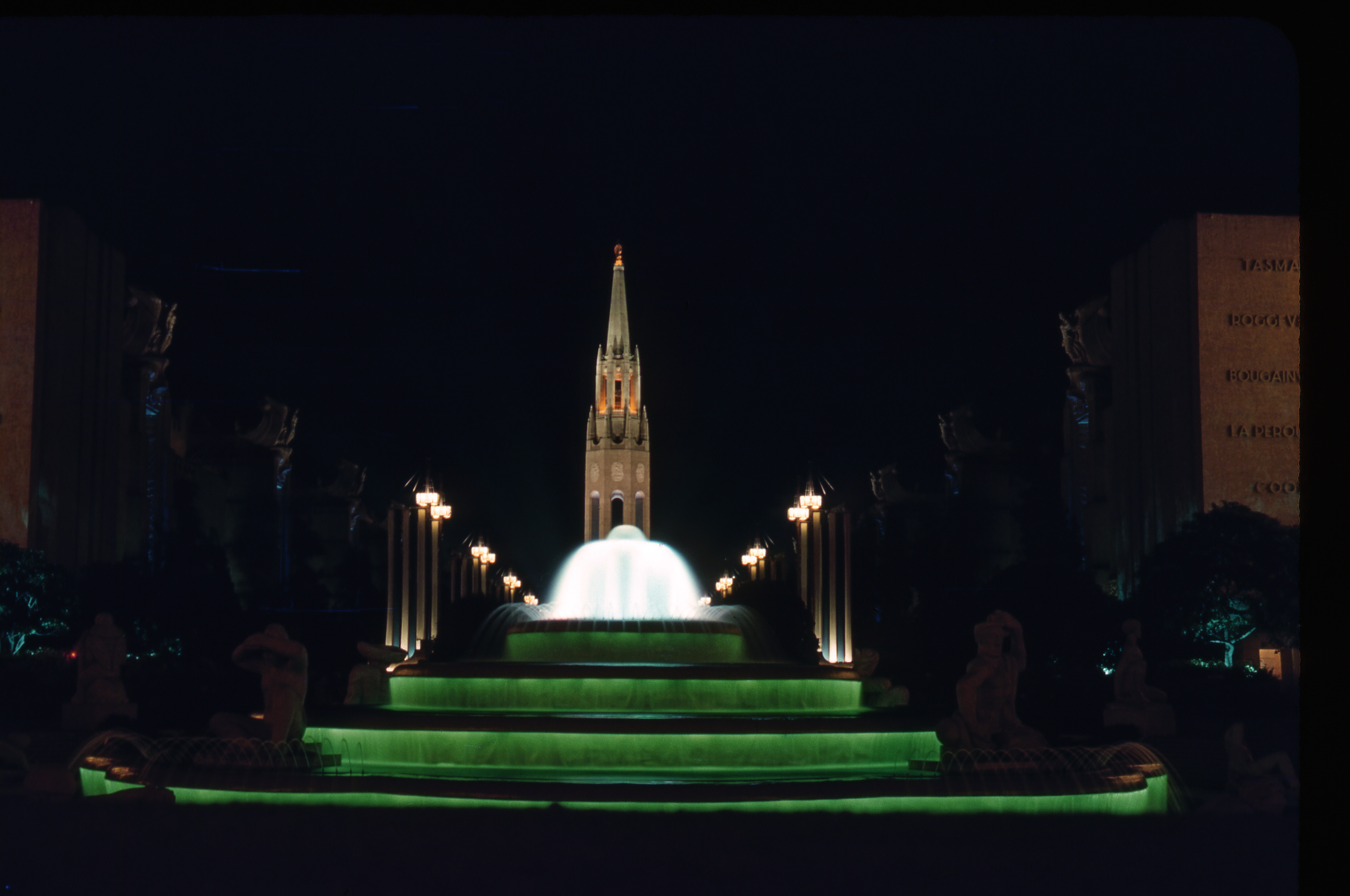 Gothic-esque, the Tower of the Sun epitomized the remix of architectural styles that characterized the fair. The tallest structure, it was billed as "a beacon to Pacific unity." At night the entire fair was lit up in a spectrum of colors. (Treasure Island Museum/Paul Totah, 1939)