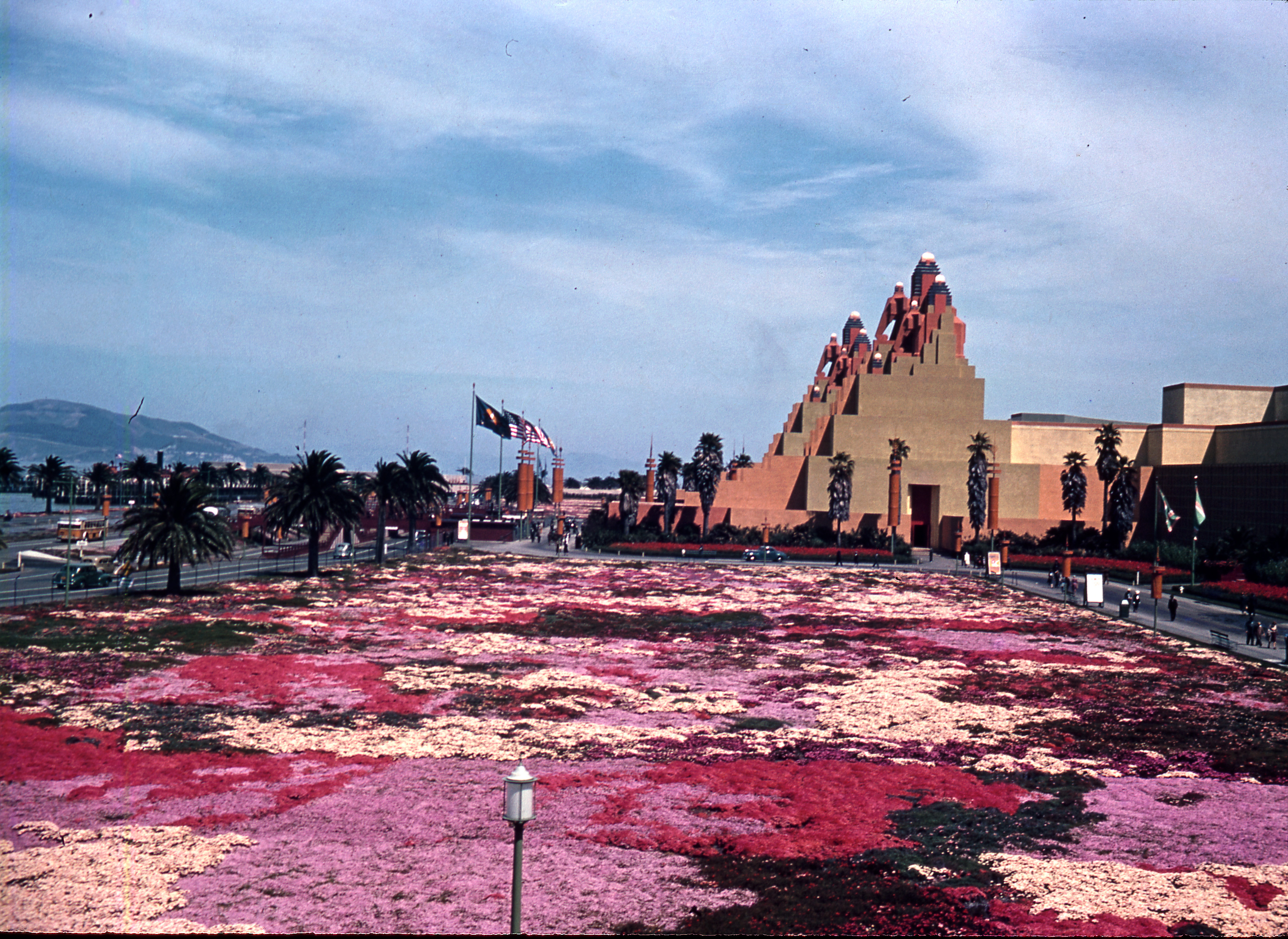 The field of flowers sat beside the fair's Elephant Towers. They were named for the decorations atop the building's pinnacles — pachyderms wearing howdah saddles. (Treasure Island Museum/ Paul Totah, 1939)