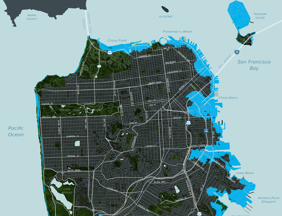 This San Francisco Planning Department map shows an upper range SLR projection and flooding at the end of the century on the mainland. The map models 66” inches of SLR, also the projected, upper range number in use by the Treasure Island Development Authority (TIDA) and partners in planning adaptive design features for the new development. (City of San Francisco Planning, 2021)