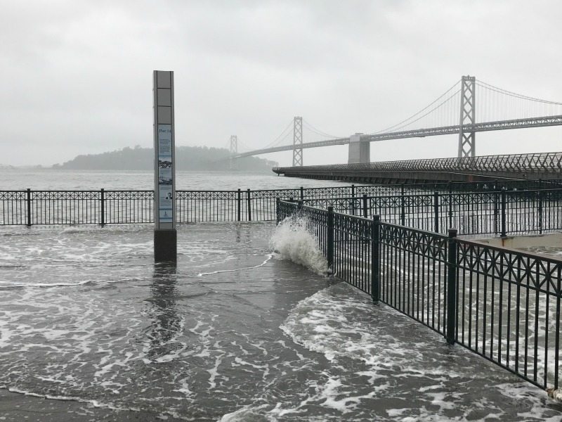 Waves from a king tide overtop San Francisco's Pier 14. Yerba Buena Island is in the distance. (https://twitter.com/burritojustice, 2021)